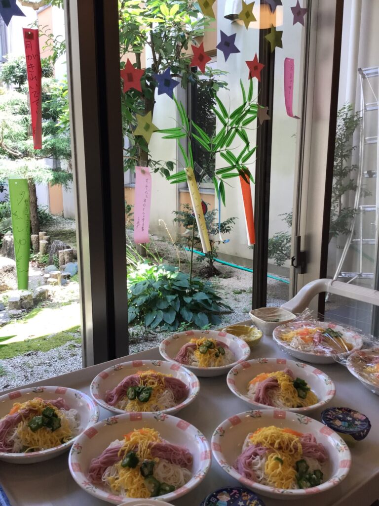 お知らせ 七夕の日 (くつかけホーム) 7月に入り七夕の時期がやってきました。 くつかけホームでも七夕のお祝いをします。 そして七夕といえば願い事、短冊に様々な願いを書いています。 皆さんいろんな願い事を書き、笹にかけています。皆さんの願いが叶うといいですね! 天の川に見立てた七夕の日限定のデザートと七夕の日に合わせてそうめんを頂きました。 皆様おいしいと言われ大変喜ばれていました! 食堂での食事提供を再開しました!【勅使苑】 前の記事 【くつかけの家】🖌海雲先生の書道教室🖌 次の記事