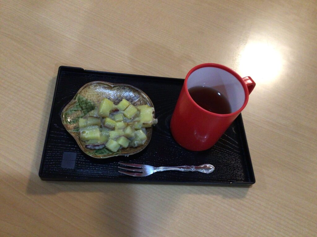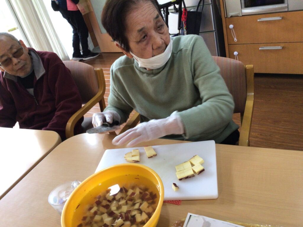慣れた手つきで 硬いさつま芋を包丁で切って