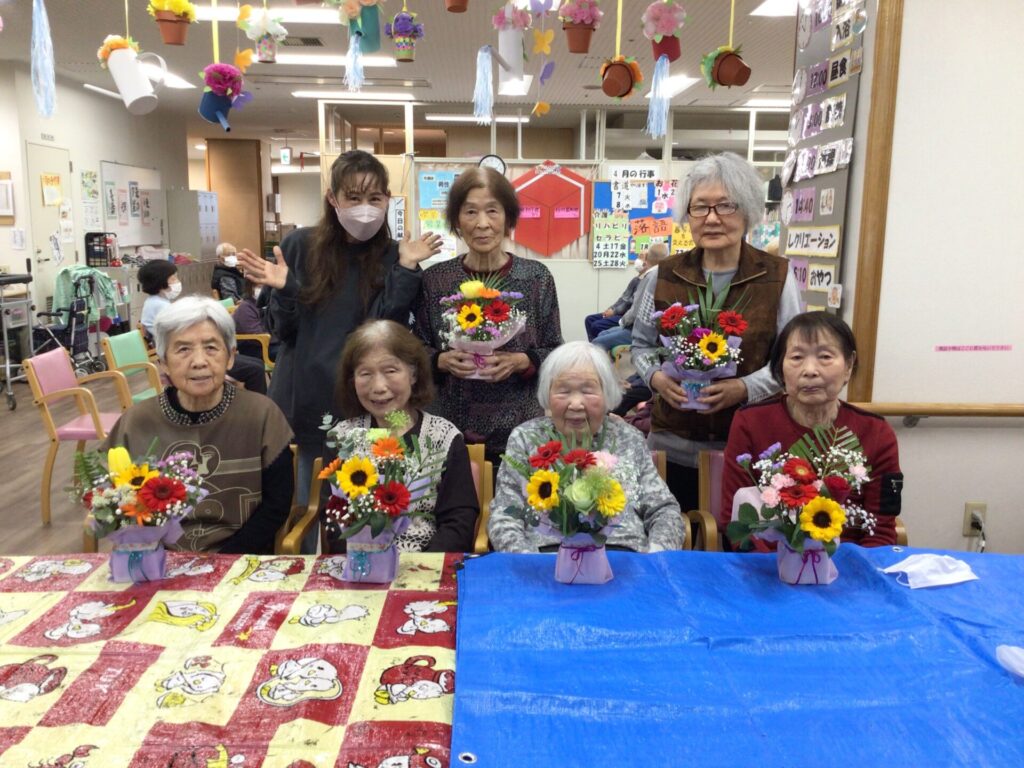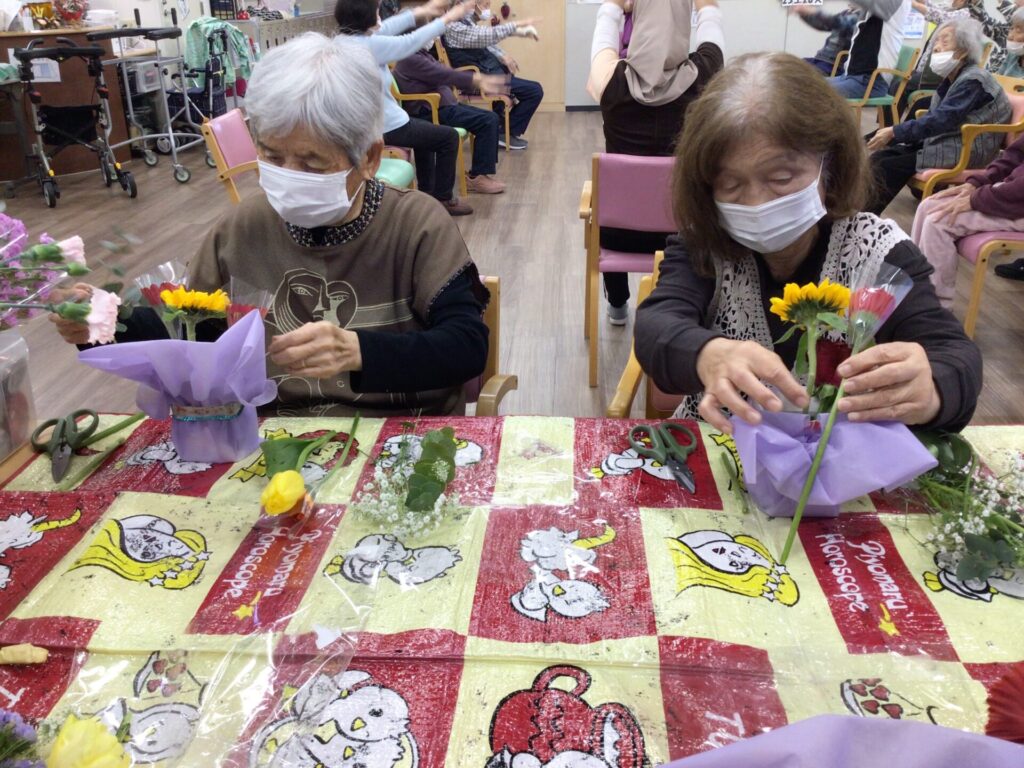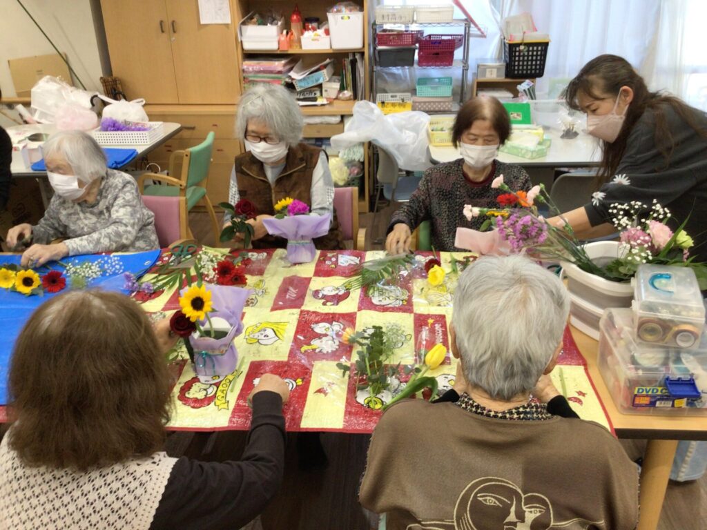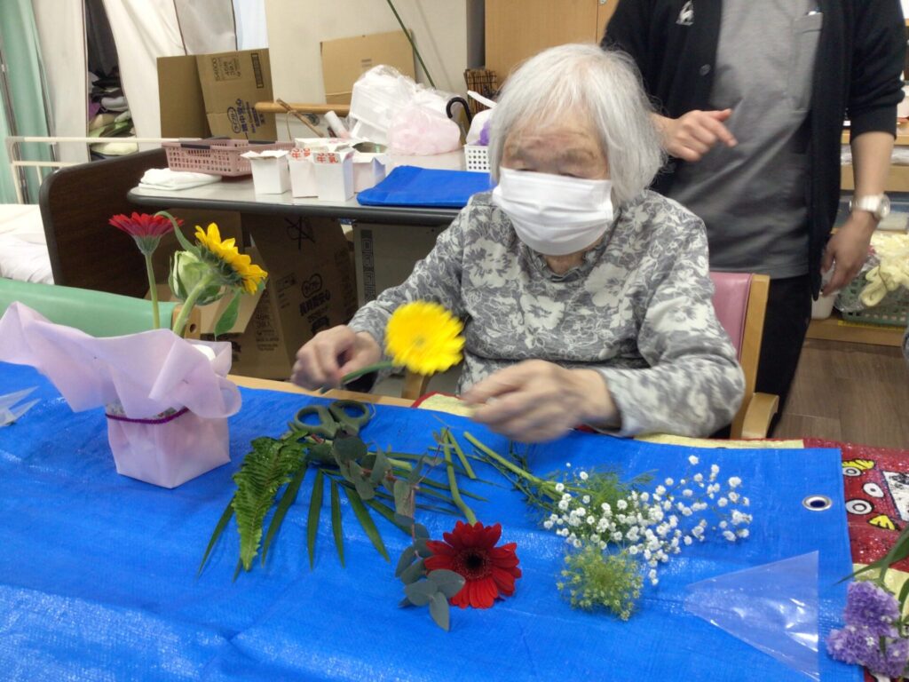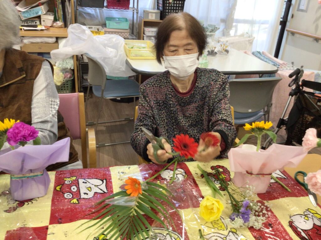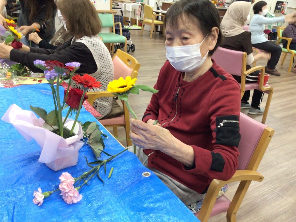 4月16日に勅使苑デイサービスセンターで講師を招いて、フラワーアレンジメントの慰問を行いました。